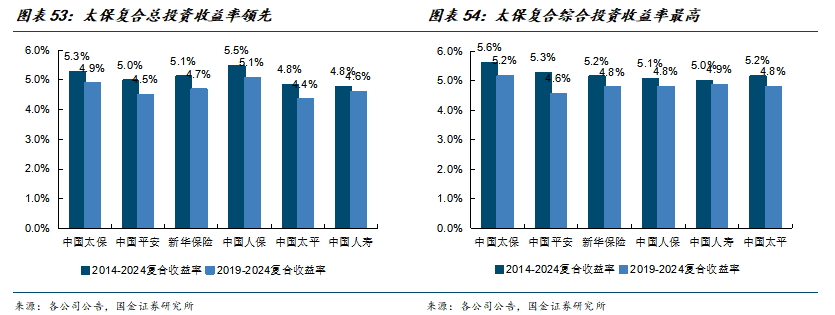 资产端:综合投资能力较强,处于同业上游水平。公司资产配置稳健,固收方面早在2018年便提出增配国债拉长资产久期, 2025H1债券占比为62.4%仅次于太平,固收资产久期延展至12.0年; 权益方面股票和权益型基金占比稳步提升,25H1提升0.6pct至11.8%,增配幅度低于同业,且投资策略以股息价值策略为主,截至2025H1,公司OCI股票占比33.8%,处于行业中等水平,预计后续仍将提升。稳健的投资风格带来长期投资收益率领先,2014-2024年太保复合综合投资收益率为5.6%,高于第二的平安0.3pct,复合总投资收益率5.3%,仅次于人保的5.5%。