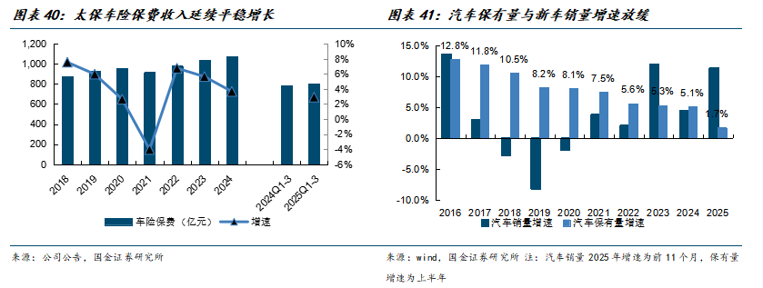 汽车保有量与新车销量增速趋势性放缓,预计车险低增长将延续。2018-2024年公司车险年均复合增速为3.4%,增速较低一方面受车险综改影响,另一方面汽车保有量增速与汽车销量增速的放缓也有影响。2025Q1-3车险保费同比增长2.9%,预计全年稳健增长延续。随着2026年汽车补贴退坡,预计汽车销量明年将承压,进而传导到车险,后续车险将维持稳健增长。