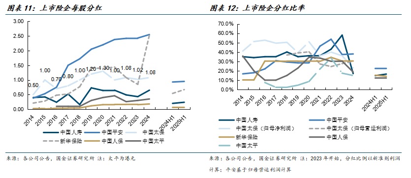 寿险业务贡献大多数利润。从净利润来看,寿险业务贡献率基本在70%以上,2025H1寿险净利润占比72.8%,财险净利润占比19.9%。从营运利润来看,寿险营运利润贡献率超75%,25H1占比75.4%。