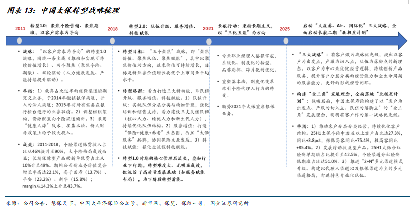 中国太保坚持长期发展理念,多年来通过持续改革转型,逐步成为国内领先的综合性保险集团。2011年开启转型1.0,聚焦个险、聚焦期交。为应对保险行业深度调整的“新周期”,公司在2018年开启转型2.0,虽无明显成效,但沉淀了高质量发展基础,为下阶段转型蓄能。2021年开启长航行动转型,以个险渠道“三化五最”为核心的队伍升级举措已落地、改革成效正逐步显现。2023年长航行动一期顺利收官,开始进入二期工程建设,着重强化内勤管理升级。2025年正式启动“大康养、AI+、国际化”三大战略,“长航行动”纵深推进转型新阶段,全面启动长航二期“北极星计划”,产品与队伍改革深化,客户分层分类结构继续优化,寿险引擎持续发力。