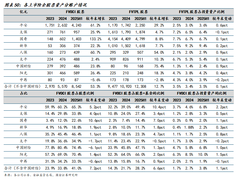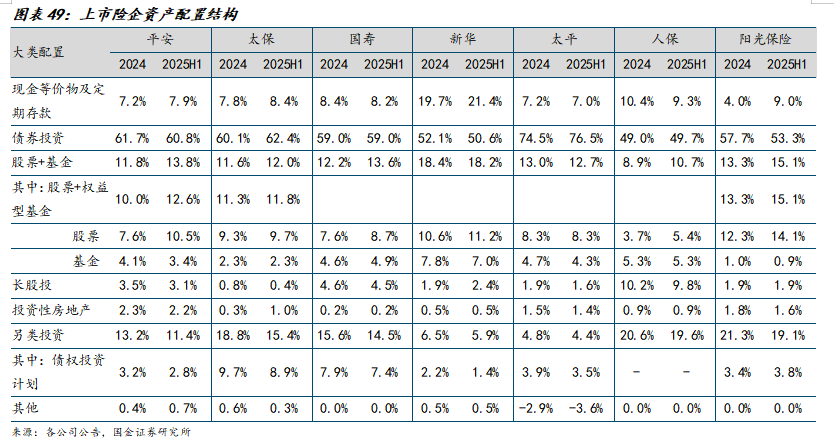 固收较早布局长久期利率债,权益稳步提升。1)固收方面:公司早在2018年便提出增配国债拉长资产久期,此后持续增配长期利率债,2025H1债券占比为62.4%仅次于太平,且国债、地方政府债、政策性金融债占投资资产的47.4%,固收资产久期延展至12.0年。2)权益方面:稳步增加公开市场权益资产配置,其中25H1股票和权益型基金占比提升0.6pct至11.8%,增配幅度低于同业。