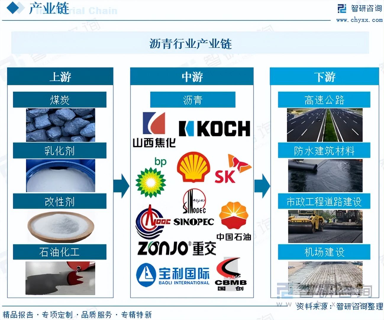沥青产业链上游为原材料,包括煤炭、乳化剂、改性剂和石油化工。产业链中游为沥青的生产制造环节。产业链下游为应用领域,包括高速公路、防水建筑材料、市政工程道路建设、机场建设等。