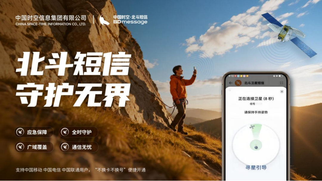 2月5日,中国时空携手中国移动、中国电信、中国联通三大运营商推出北斗短信大众卫星通信服务,让北斗时空服务成为触手可及的科技守护,真正实现“北斗就在身边,时空服务你我”。
