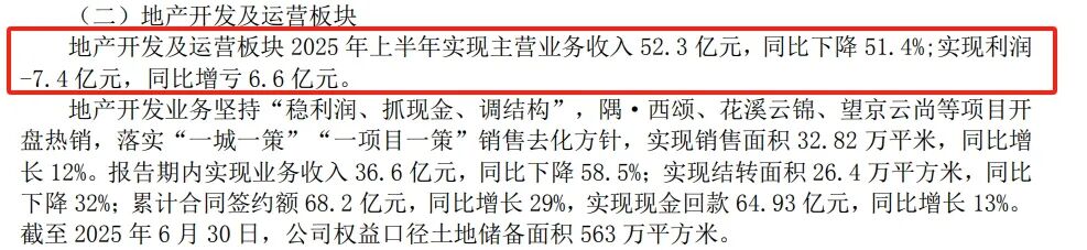 地产开发及运营板块2025年上半年实现主营业务收入52.3 亿元,同比下降51.4%;实现利润-7.4亿元,同比增亏6.6亿元。