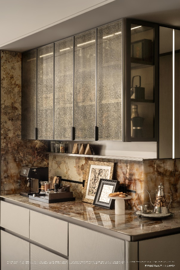 与多数项目将奢石用于电视背景墙造景不同,其将潘多拉石材、奢石等材质落地于餐边柜、卫浴台面等生活场景触点,把高维审美拉满。