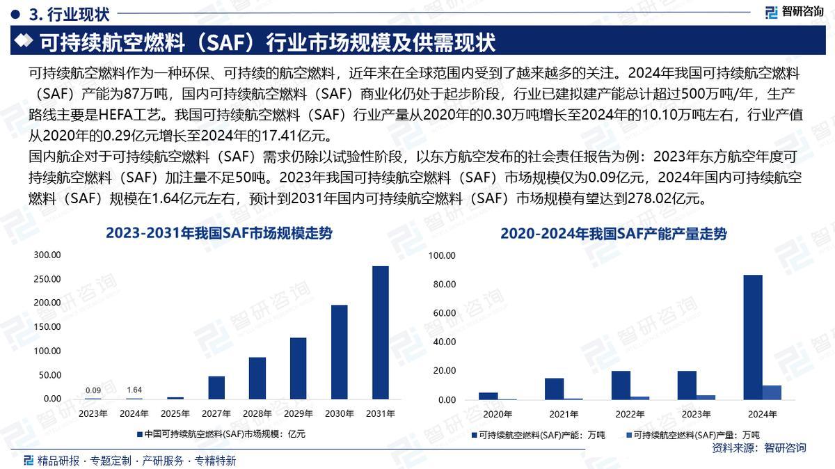中国市场规模:2023年我国可持续航空燃料(SAF)市场规模仅为0.09亿元,2024年国内可持续航空燃料(SAF)规模在1.64亿元左右,预计到2031年国内可持续航空燃料(SAF)市场规模有望达到278.02亿元。