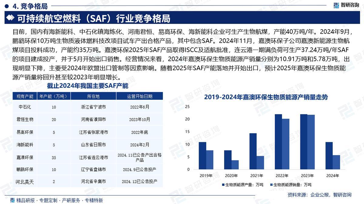 竞争情况:目前,国内有海新能科、中石化镇海炼化、河南君恒、易高环保、海新能科企业可生产生物航煤,产能40万吨/年。2024年9月,鹏鹞环保10万吨生物质液体燃料技改项目试车产出合格产品,其中包含SAF。2024年11月,嘉澳环保子公司嘉澳新能源生物航煤项目投料成功,产能约35万吨。