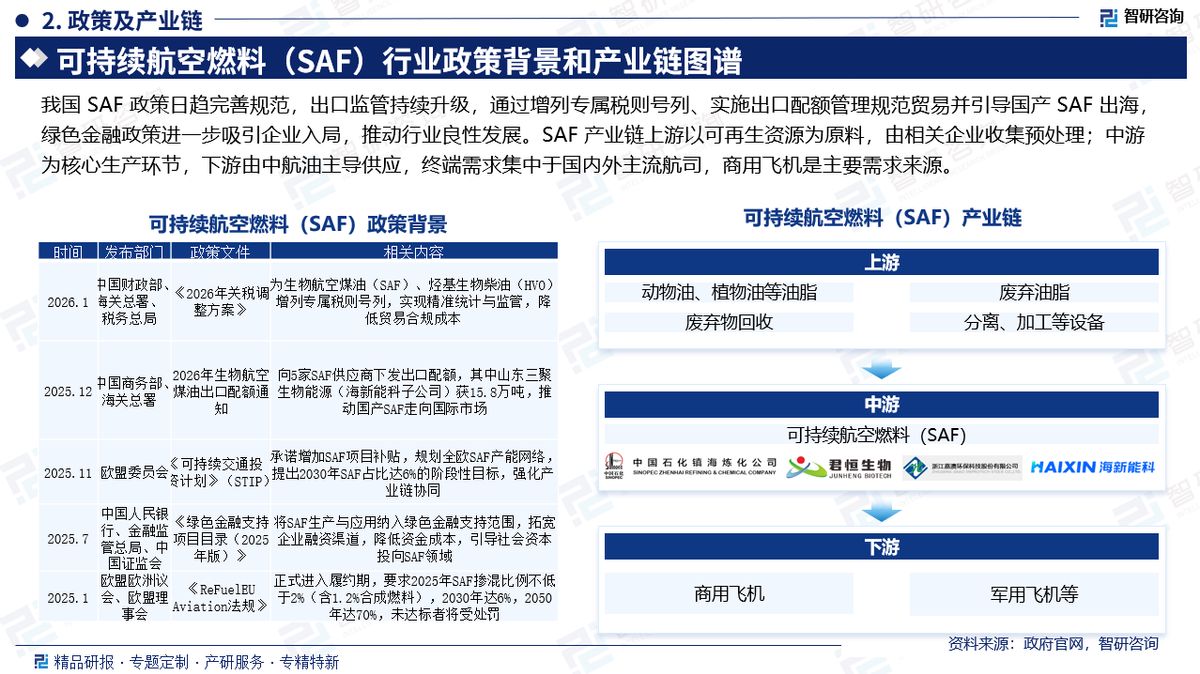 行业政策:当前我国SAF相关政策日趋完善规范,出口管制不断趋严且愈发正规,通过增列专属税则号列实现精准监管、规范贸易合规流程,同时通过出口配额管理引导国产SAF有序走向国际市场,叠加绿色金融支持政策,进一步拓宽企业融资渠道、降低发展门槛,吸引更多企业入局布局SAF产业,推动行业良性发展。