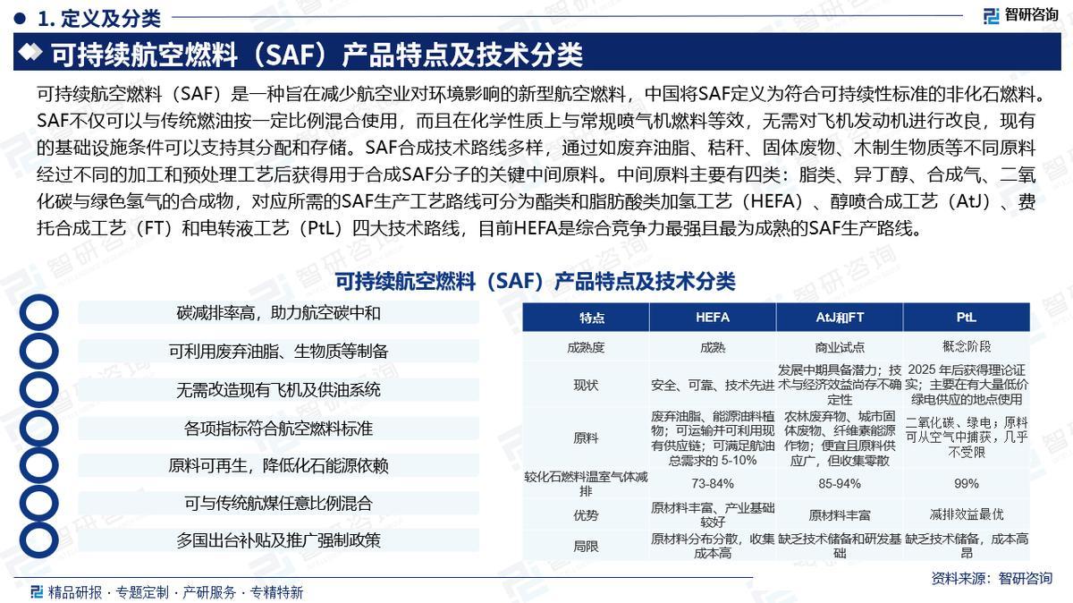 行业定义及分类: 可持续航空燃料(SAF)是一种旨在减少航空业对环境影响的新型航空燃料,中国将SAF定义为符合可持续性标准的非化石燃料。通过使用更清洁、可再生的原料,如餐饮废弃油、动植物废油脂等,替代传统的石油基航空燃料,以实现减少二氧化碳排放和促进航空业可持续发展的目标。2
