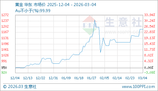 据生意社监测,黄金03月04日最新价格1186.43元/克,最近5天上涨3.63%,10天上涨7.13%,30天上涨13.65%,60天上涨21.43%。