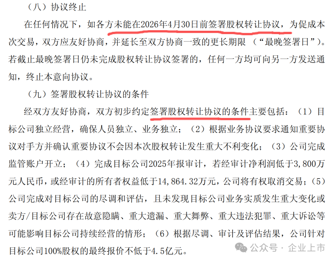 爱普股份在公告中多次强调风险。目前签署的仅为意向协议,4.5亿估值和1.5亿业绩承诺均为初步数字,最终交易价格需待尽职调查、审计评估后才能确定。协议也明确,若爱普股份最终报价低于4.5亿元,卖方有权无条件终止交易。因此,这笔交易能否在4月30日前最终落地,仍存在较大不确定性。
