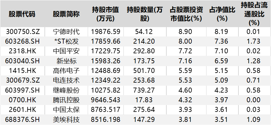 这十大重仓股中,*ST松发、中国平安、新坐标、中国太保、美埃科技均为新进,她大幅加仓了高伟电子,减仓宁德时代、电连技术、继峰股份、腾讯控股。三环集团、信达生物、东山精密、立讯精密、科博达在第四季度退出兴全合瑞A十大重仓股。