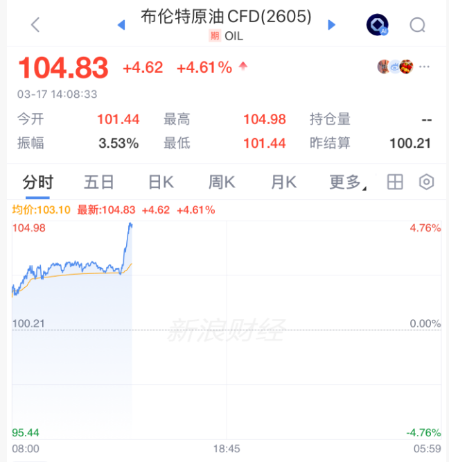 3月17日午后,国际油价直线拉升,布伦特原油涨超4%,纽约原油涨超5%。