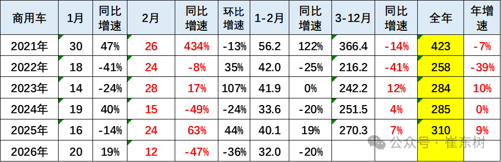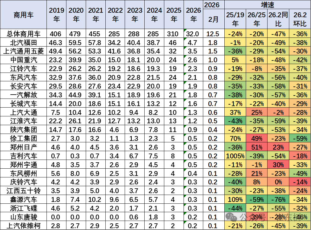 今年商用车1月19.5万台增长较强,2月商用车国内销量实现12万台,同比下降47%,环比降36%。2026年1-2月商用车国内销量实现32万台,同比下降20%,相对于2022年以来的商用车平稳期,2026年类似2024年,总体增速不会太强。
