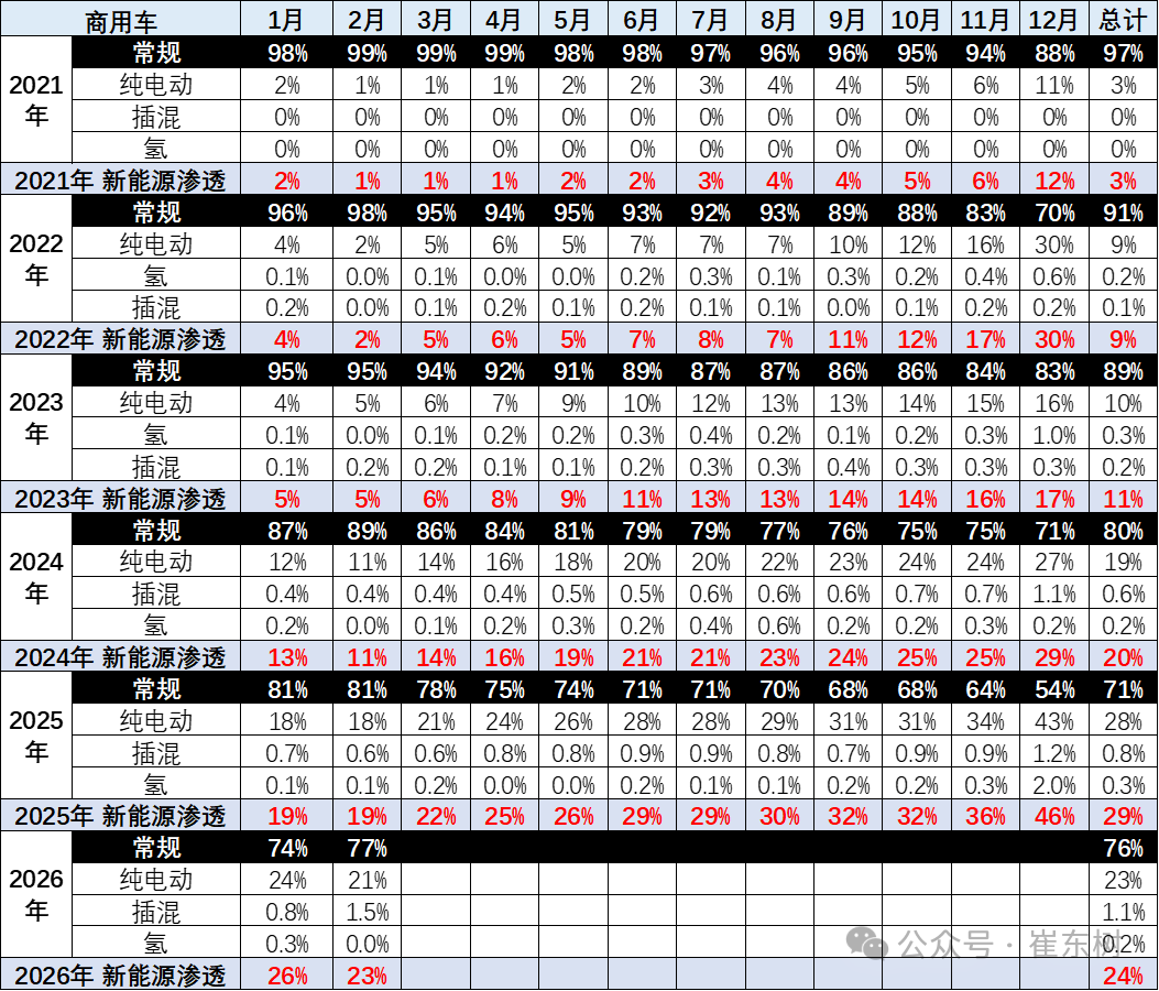 2026年1-2月商用车新能源渗透率24%, 较同期增长5个点,强于乘用车的增长。2026年仍是纯电动增长较强,插混与增程的表现改善较大。