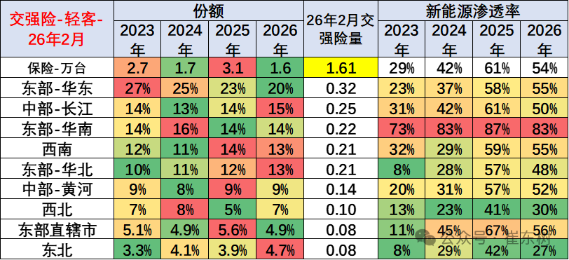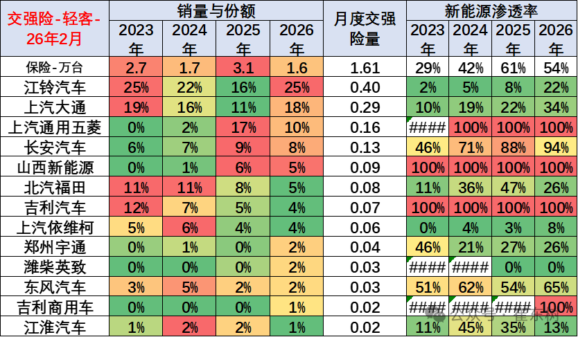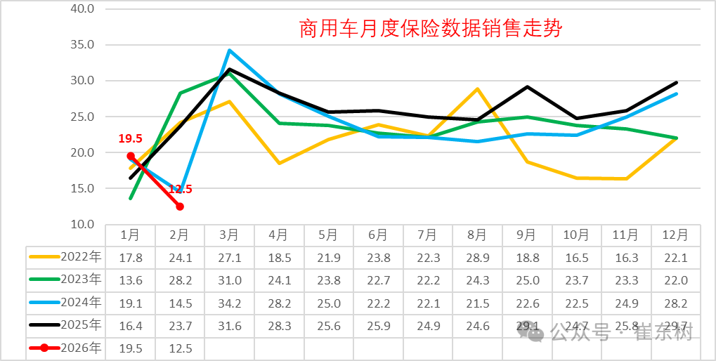 2026年1月份新能源商用车达到5万台,同比增长63%,环比下降64%。2月新能源商用车下降到2.85万台,低于2026年1月。2026年1-2月新能源商用车交强险7.8万台,累计增速3%。