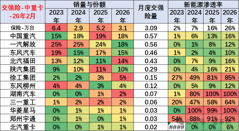 2026年2月的卡车新能源渗透率17.5%,卡车较同期均有大幅提升;客车新能源渗透率53%,持续徘徊在60%左右。其中重卡达到27%、轻卡达到18%,高油耗高税收的物流车型新能源渗透率提升较大。