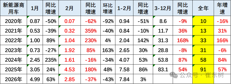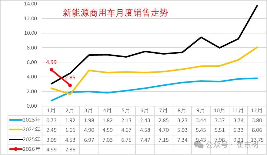 2025年新能源商用车整体呈现快速拉升的良好局面。3-12月持续高位,新能源增长较强。2026年1月的新能源销量迅速达到5万台的高位,但2月回落明显。