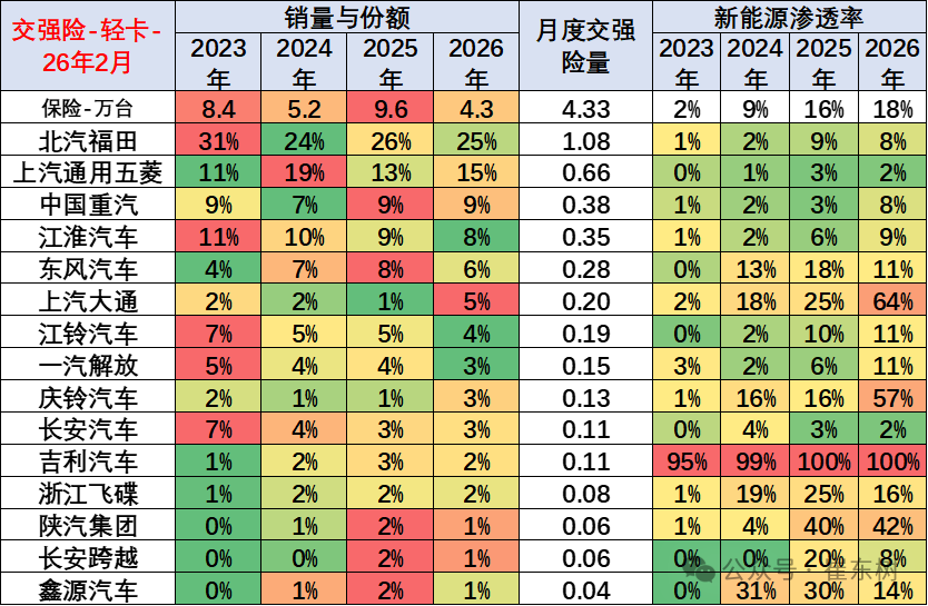 2025年新能源商用车在商用车渗透率达到29%的水平,相对于2024年实现了较好提升。2026年2月份新能源渗透率达到23%,相对于去年2月的19%,提升4个百分点,表现相对较一般。