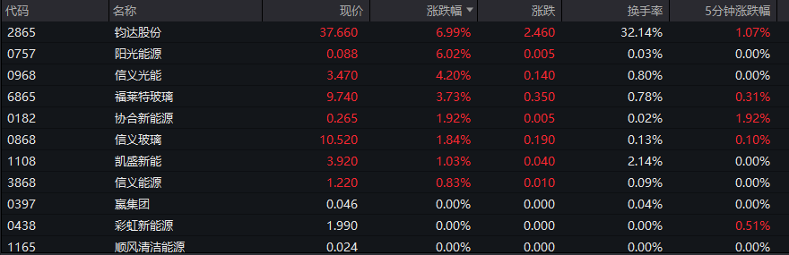 港股方面,光伏太阳能板块同步走强。钧达股份一度拉升涨超10%,信义光能涨超4%,福莱特玻璃涨约4%。