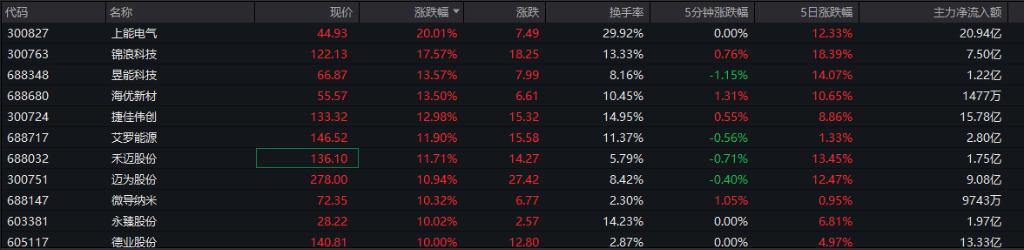 具体来看,A股太空光伏概念持续走高。钧达股份封涨停,捷佳伟创触及20cm涨停,迈为股份、拉普拉斯、连城数控、晶科能源及奥特维均大涨超10%。同时,光伏设备概念股全面爆发。上能电气20cm涨停,首航新能涨逾19%,九洲集团、艾罗能源涨逾15%,锦浪科技、昱能科技涨逾14%。