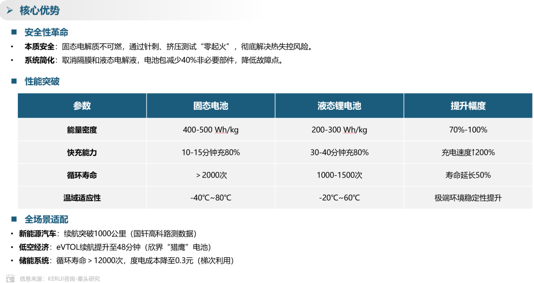 固态电池的核心优势在于安全性变革、性能的突破和全场景适配。