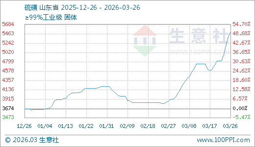 据生意社监测,硫磺03月26日最新价格5500.00元/吨,最近5天上涨14.19%,10天上涨19.13%,20天上涨27.51%,30天上涨44.61%,90天上涨49.69%。