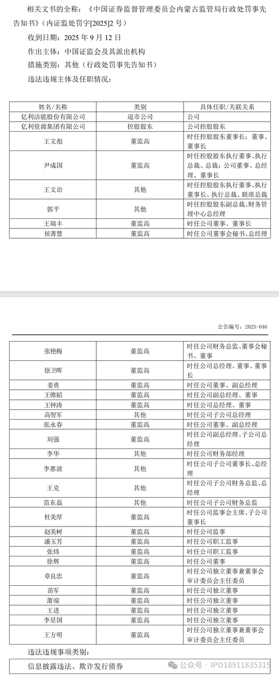 亿利洁能股份有限公司(以下简称亿利洁能)、亿利资源集团有限公司(以下简称亿利集团)涉嫌信息披露违法违规、欺诈发行一案已调查完毕,内蒙古证监局依法拟作出行政处罚。经查明,亿利洁能、亿利集团涉嫌存在以下违法事实: