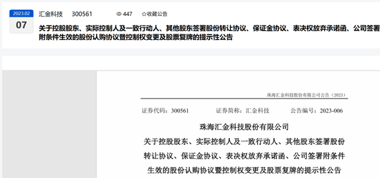 2023 年5月28日,陈喆女士、马铮先生、瑞信投资与淄博国投签署了《关于珠海汇金科技股份有限公司之股份转让协议之补充协议一》(以下简称《补充协议》),基于平等协商,就股份转让协议中第一次股份转让的具体安排进行调整,并对相关条款进行了补充。具体内容详见公司于2023年5月30日在巨潮资讯网(www.cninfo.com.cn)披露的《关于控股股东、实际控制人及一致行动人、其他股东签署<股份转让协议之补充协议一>暨控制权变更事项的进展公告》(公告编号:2023-045)。
