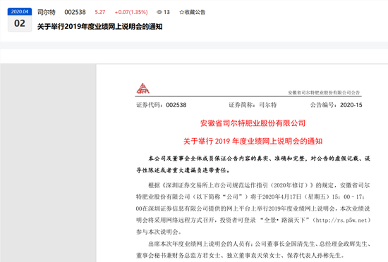 根据《深圳证券交易所上市公司规范运作指引(2020年修订)》的规定,安徽省司尔特肥业股份有限公司(以下简称“公司”)将于2020年4月17日(星期五)15:00–17:00在深圳证券信息有限公司提供的网上平台上举行2019年度业绩网上说明会,本次业绩说明会将采用网络远程方式召开,投资者可登录 “全景•路演天下”(http://rs.p5w.net)参与本次说明会。