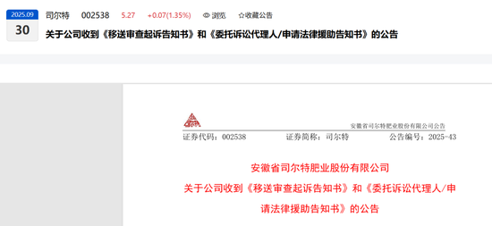 2025年9月29日,安徽省司尔特肥业股份有限公司(以下简称“公司”)收到宣城市公安局送达的《移送审查起诉告知书》和宣城市人民检察院送达的《委托诉讼代理人/申请法律援助告知书》(宣检委代/申援〔2025〕7号),现将相关信息披露如下: