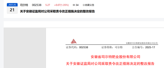 安徽省司尔特肥业股份有限公司(以下简称“公司”或“本公司”)于2025 年4月21日收到中国证券监督管理委员会安徽监管局(以下简称“安徽证监局”)出具的《关于对安徽省司尔特肥业股份有限公司采取责令改正措施的决定》(行政监管措施决定书〔2025〕29号)(以下简称“《决定书》”),要求公司在收到《决定书》起30日内完成整改工作并向安徽证监局提交整改报告。具体内容详见公司于2025年4月23日发布的《安徽省司尔特肥业股份有限公司关于收到安徽证监局对公司采取责令改正行政监管措施决定的公告》(公告编号:2025-2)。