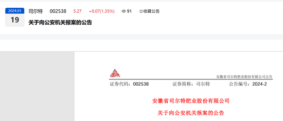 近日,安徽省司尔特肥业股份有限公司(以下简称“公司”)发现,公司审计部副部长黄席利等可能涉嫌职务侵占犯罪。在黄席利等拒不配合公司调查并提出辞职后,公司先后向宣城市公安局经济犯罪侦查支队、宁国市公安局经济犯罪侦查大队报案。2024年1月17日,公司收到宁国市公安局出具的《受案回执》,案件已受理,受案登记表文号为宁公(经)受案字〔2024〕155号。