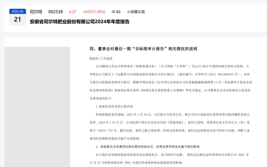 公司聘请信永中和会计师事务所(特殊普通合伙)(以下简称“信永中和”)为公司2024年度财务报告的审计机构,信永中和向公司提交了《安徽省司尔特肥业股份有限公司审计报告》(报告编号:XYZH/2025HFAS1B0068),该审计报告为保留意见的审计报告。根据中国证监会《公开发行证券的公司信息披露编报规则第14号—非标准审计意见及其涉及事项的处理》和深圳证券交易所《深圳证券交易所股票上市规则》等有关规定,公司董事会对该非标准审计意见涉及事项说明如下: