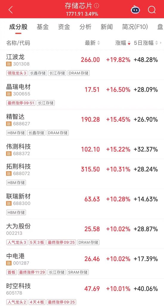 午后,存储芯片板块上攻,江波龙、拓荆科技、伟测科技、佰维存储等多股盘中股价创历史新高。大为股份、中电港、德明利、时空科技等多股涨停。