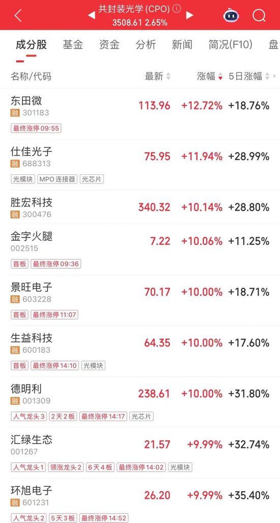 CPO概念持续活跃,金字火腿、景旺电子、生益科技、德明利、汇绿生态等多股涨停;东田微收盘涨超12%,早盘一度触及“20CM”涨停,仕佳光子涨幅居前。