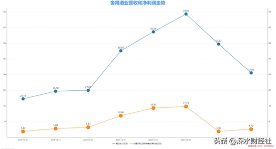 从股价上,舍得酒业从2023年初开始就进入漫漫熊途,市值至今已经跌掉了约70%,所以市场的走势也预判了舍得酒业的基本面一定是发生了巨大逆转。