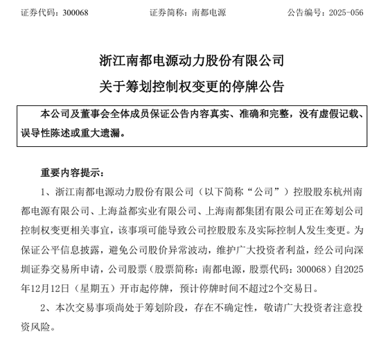鉴于上述事项尚存在重大不确定性,为保证公平信息披露,维护投资者利益,避免公司股价异常波动,根据《深圳证券交易所创业板股票上市规则》及《深圳证券交易所上市公司自律监管指引第6号——停复牌》的相关规定,经公司向深圳证券交易所申请,公司股票(股票简称:南都电源,股票代码:300068)自2025年12月12日(星期五)开市起停牌,预计停牌时间不超过2个交易日。