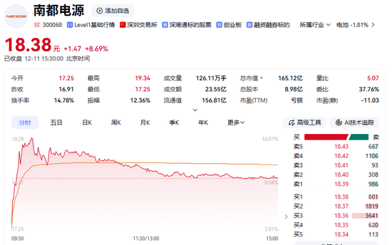 盘面上,南都电源今日早盘一度涨超14%,后涨幅收窄,截至收盘,该股上涨8.69%,报18.38元/股,总市值165.12亿元。