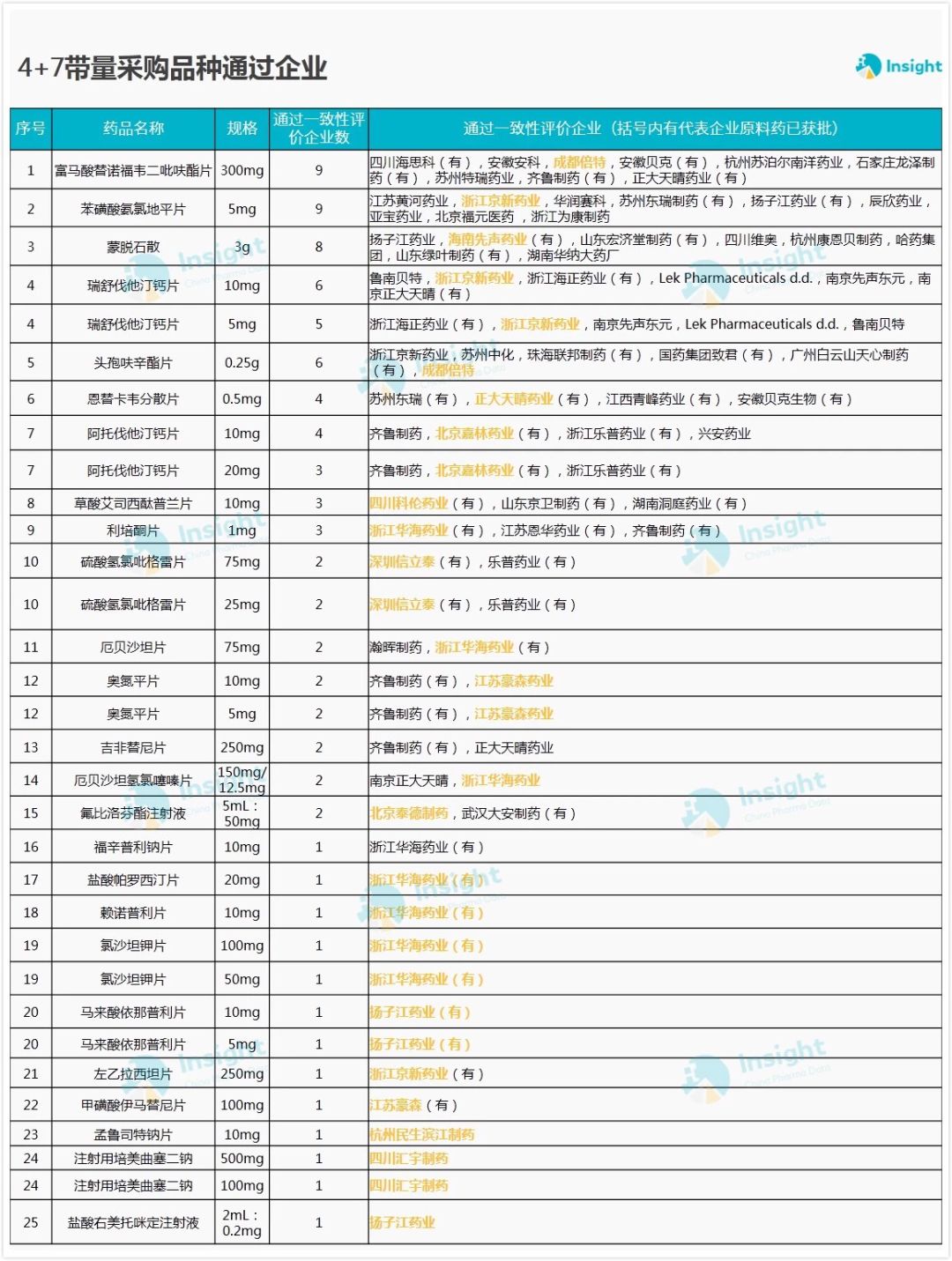 Insight数据库统计的25个中选品种通过一致性评价情况,其中也不乏上市公司的身影。