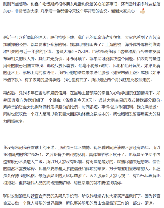 记者发现,在冷静下来后,倪张根隔日又发帖解释了事情的缘由,并得到了不少投资者的理解。他表示,“最近一年,由于众所周知的原因,股价持续下跌,我自己的现金流确实很紧。大家也看到了连续追加质押的公告,都是要求补仓惹的祸。钱都用到哪里去了?上海的楼,海外体外零售的收购和相关的最近一年多的补流,这些大概6-7亿吧。也就是说,我除了这些和梦百合未来发展布局相关的投入外,其他并无负债。”