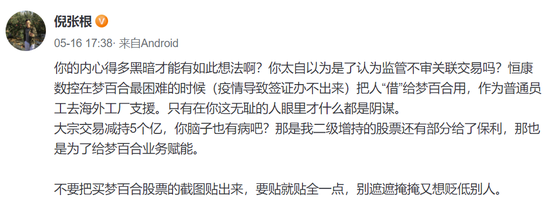 没想到,一直“潜水”的倪张根直接回怼称,“你的内心得多黑暗才能有如此想法啊?你太自以为是了,认为监管不审关联交易吗?恒康数控在梦百合最困难的时候(疫情导致签证办不出来)把人‘借’给梦百合用,作为普通员工去海外工厂支援。只有在你这无耻的人眼里才什么都是阴谋。”