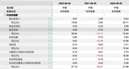 2022年上半年,营业收入同比增长52.71%,但由于成本冲击净利率下滑比较明显,净利润只追平了2020年。