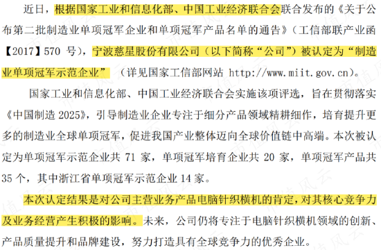 其实,慈星股份原先的传统制造做得还可以,针织机械设备的毛利率稳居在30%左右,还曾一度被国家工信部认定为“制造业单项冠军示范企业”。