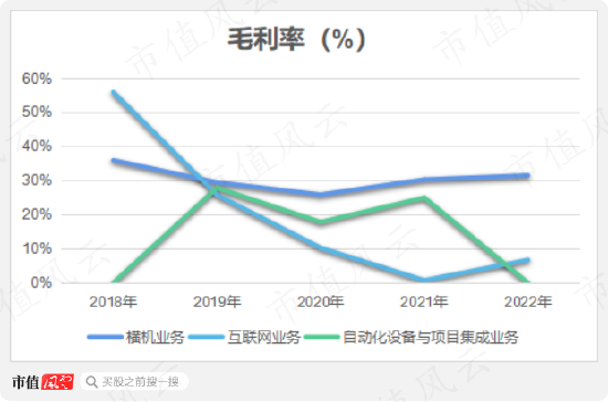 收购互联网业务后,好日子就到头了。毛利率从2018年的55.91%跌至2022年的6.76%,拉低了公司整体盈利水平。