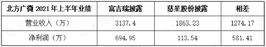 更有意思的是,根据富吉瑞的投资公告,2021年上半年,北方广微实现营收3,137.4万、净利润694.95万;但根据慈星股份2021年半年报,同期的北方广微营收为1,863.23万、净利润为113.54万。