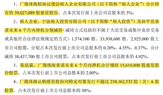 2021年1月18日,裕人企业将持有的慈星股份3,902.71万股,以13元/股价格转让给广微珠海。