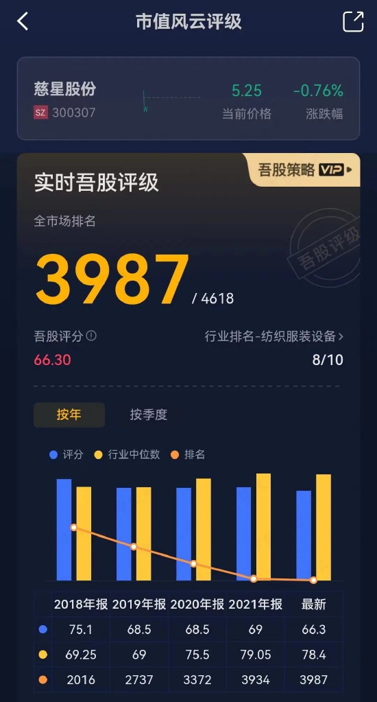 而有这样一位老板,慈星股份的吾股评级自然是一路出溜,从全市场2016名跌至如今的3987名。