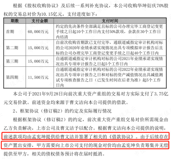 此外,2021年9月,新通联收购华坤道威数据51%股权的首期款3.75亿元,明面上是曹董事长借给上市公司的,实际上,资金出借人是孟宪坤。