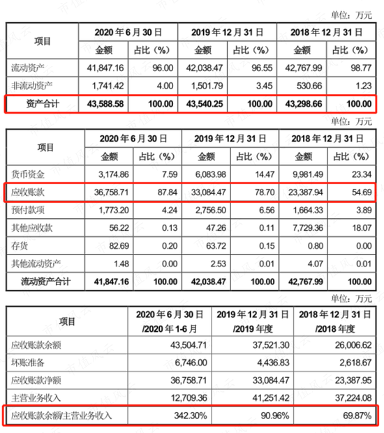 需要指出的是,华坤道威数据主要资产是应收账款:2020年6月末,总资产4.36亿元,而应收账款高达3.68亿元,应收账款占总资产的84%。